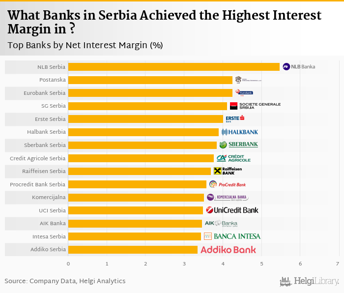 Comparing NLB Serbia with its closest peers, Banka Postanska Stedionica operated in 2017 with a net interest margin of 4.26% Eurobank Serbia reached 4.25% and Societe Generale Serbia some 4.12%.