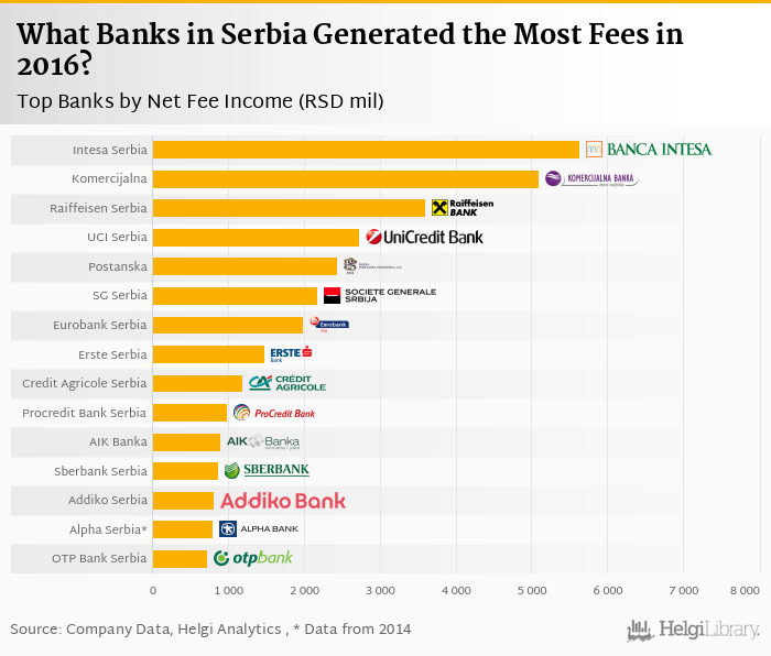 Based on a comparison of 18 banks in Serbia in 2016, Bank Intesa Serbia generated the largest fee income, followed by Komercijalna Banka Beograd and Raiffeisenbank Serbia.
