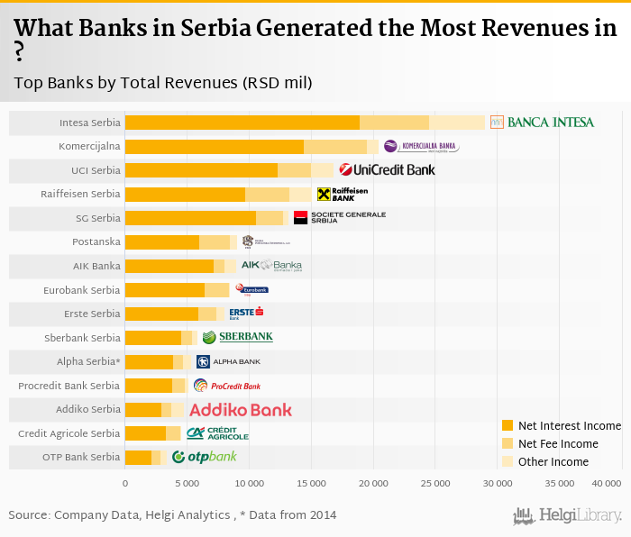 Based on a comparison of 18 banks in Serbia in 2016, Bank Intesa Serbia generated the largest revenues, followed by Komercijalna Banka Beograd and UniCredit Bank Serbia.
