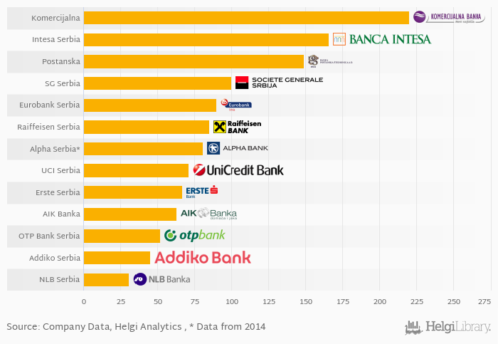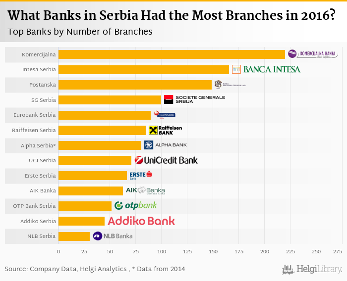 Comparing Komercijalna Banka Beograd with its closest peers, Bank Intesa Serbia operated a network of 166 branches in 2016, Banka Postanska Stedionica had 149 branches and Societe Generale Serbia had a network of 100 branches in 2016.
