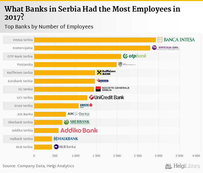 Based on a comparison of 15 banks in Serbia in 2017, Bank Intesa Serbia had the most employees, followed by Komercijalna Banka Beograd and OTP Bank Serbia.