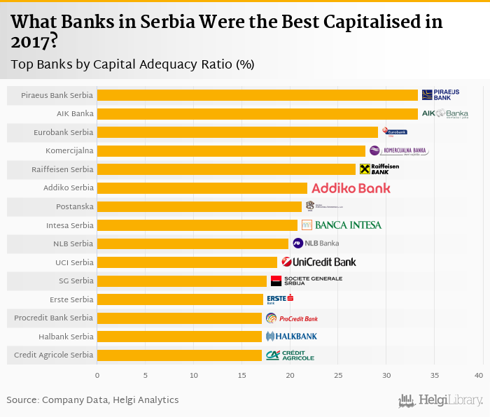 Based on a comparison of 17 banks in Serbia in 2017, Piraeus Bank Serbia was the best capitalised bank, followed by AIK Banka and Eurobank Serbia.