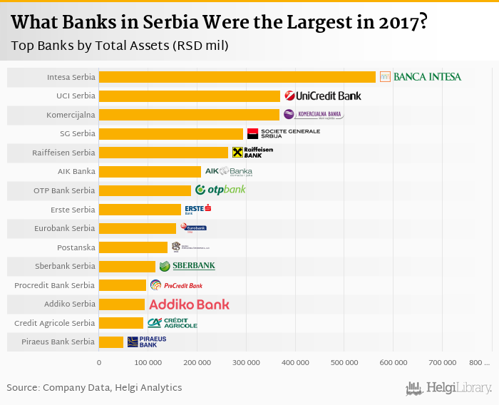 Based on a comparison of 18 banks in Serbia in 2017, Bank Intesa Serbia was the largest bank by assets, followed by UniCredit Bank Serbia and Komercijalna Banka Beograd.