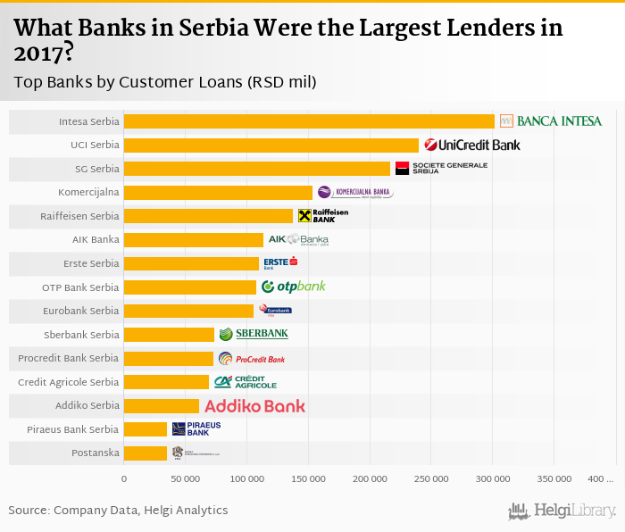 Based on a comparison of 18 banks in Serbia in 2017, Bank Intesa Serbia was the largest lender, followed by UniCredit Bank Serbia and Societe Generale Serbia.