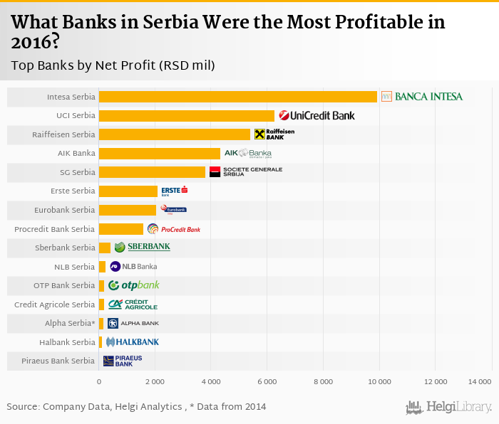 Based on a comparison of 18 banks in Serbia, Bank Intesa Serbia produced the highest net profit in 2016, followed by UniCredit Bank Serbia and Raiffeisenbank Serbia.