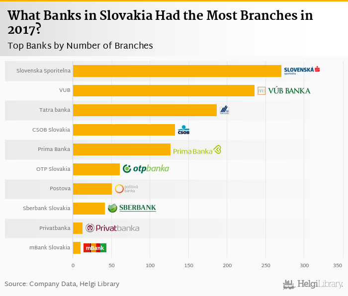 Based on a comparison of 12 banks in Slovakia in 2017, Slovenska Sporitelna had the most branches, followed by VUB Banka and Tatra banka.