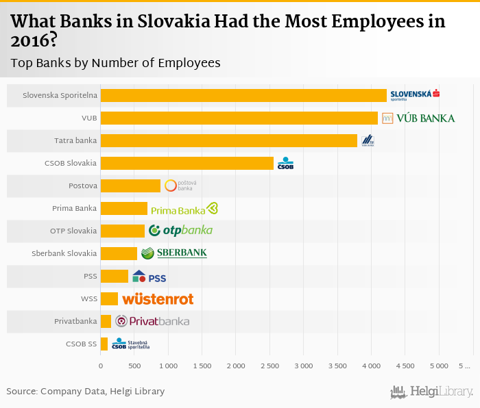Based on a comparison of 13 banks in Slovakia in 2016, Slovenska Sporitelna had the most employees, followed by VUB Banka and Tatra banka.