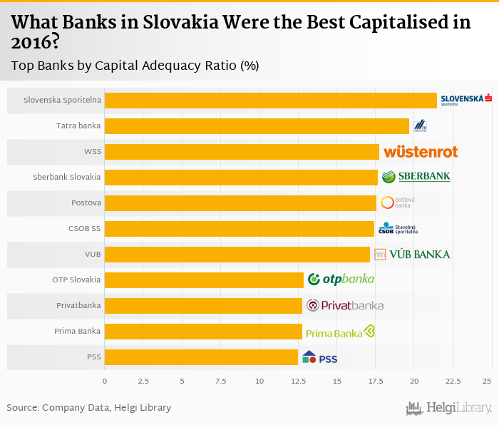 Based on a comparison of 12 banks in Slovakia in 2016, Slovenska Sporitelna was the best capitalised bank, followed by Tatra banka and Wustenrot Stavebna Sporitelna.