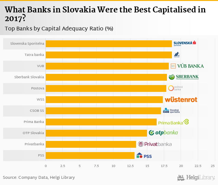 Based on a comparison of 12 banks in Slovakia in 2017, Slovenska Sporitelna was the best capitalised bank, followed by Tatra banka and VUB Banka.