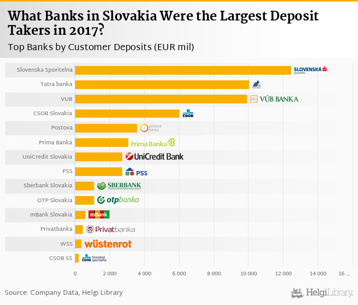 Based on a comparison of 14 banks in Slovakia in 2017, Slovenska Sporitelna was the largest deposit taker, followed by Tatra banka and VUB Banka.