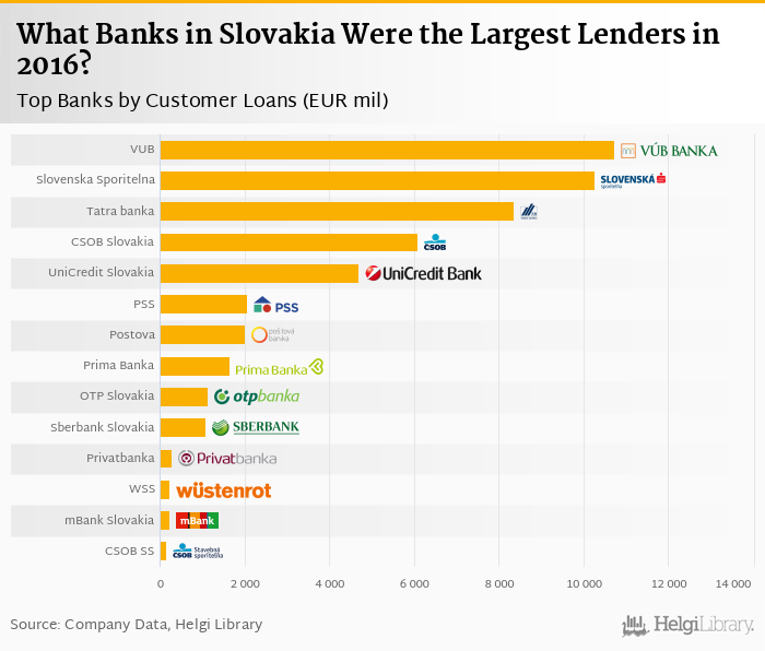 Based on a comparison of 14 banks in Slovakia in 2016, VUB Banka was the largest lender, followed by Slovenska Sporitelna and Tatra banka.
