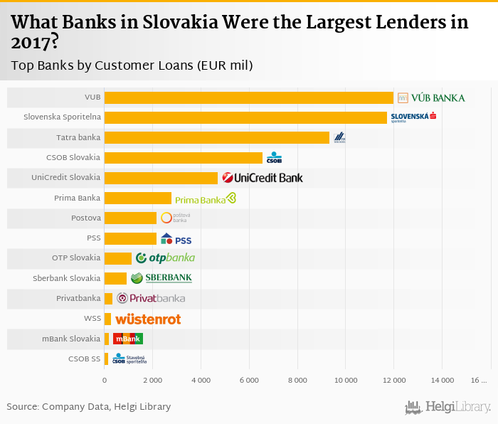 Based on a comparison of 14 banks in Slovakia in 2017, VUB Banka was the largest lender, followed by Slovenska Sporitelna and Tatra banka.
