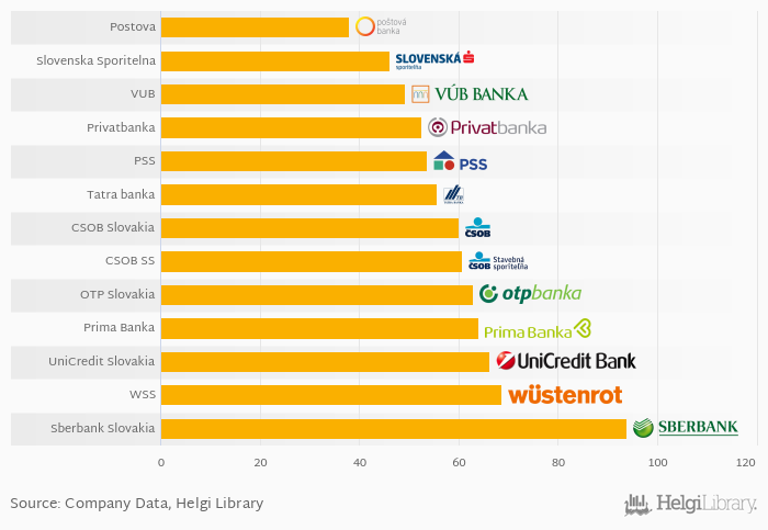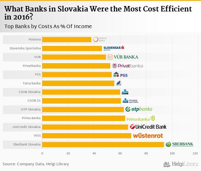 Based on a comparison of 13 banks in Slovakia in 2016, Postova Banka was the most cost efficient bank, followed by Slovenska Sporitelna and VUB Banka.