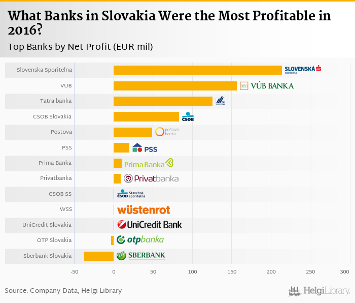 Based on a comparison of 13 banks in Slovakia, Slovenska Sporitelna produced the highest net profit in 2016, followed by VUB Banka and Tatra banka.