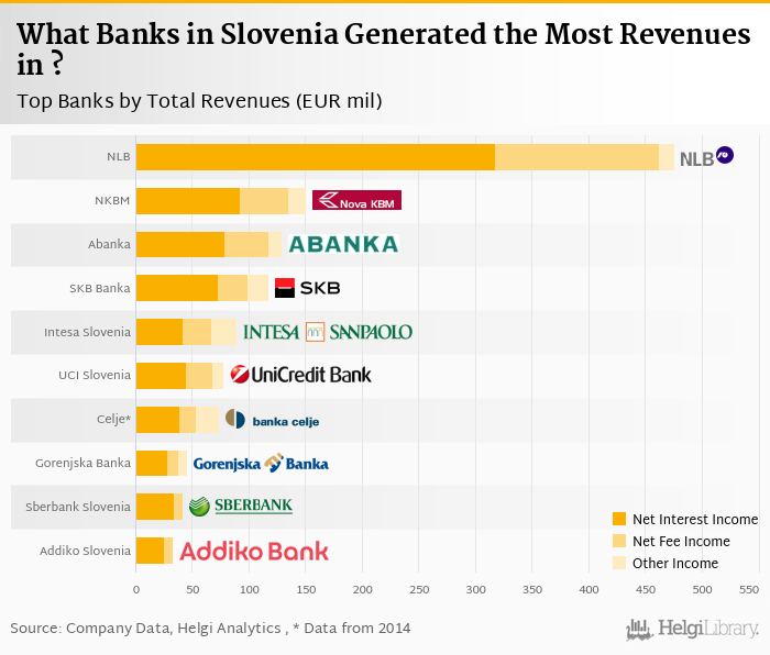 Based on a comparison of 10 banks in Slovenia in 2016, Nova Ljubljanska banka generated the largest revenues, followed by NKBM Group and Abanka Group.