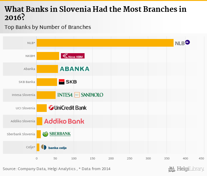 Based on a comparison of 9 banks in Slovenia in 2016, NKBM Group had the most branches, followed by Abanka Group and SKB Banka.