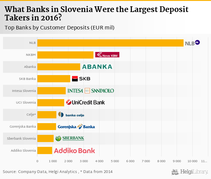 Based on a comparison of 10 banks in Slovenia in 2016, Nova Ljubljanska banka was the largest deposit taker, followed by NKBM Group and Abanka Group.
