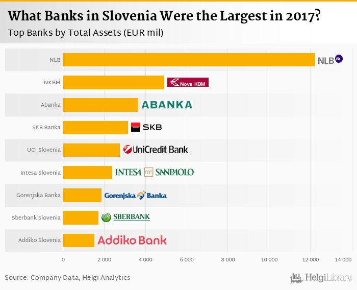 Based on a comparison of 10 banks in Slovenia in 2017, Nova Ljubljanska banka was the largest bank by assets, followed by NKBM Group and Abanka Group.