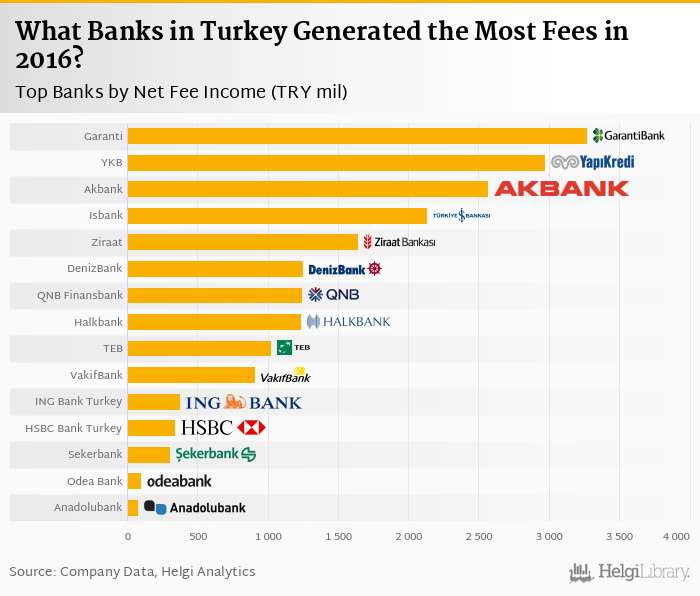 Based on a comparison of 22 banks in Turkey in 2016, Garanti Bank generated the largest fee income, followed by Yapi Kredi Bank and Akbank.