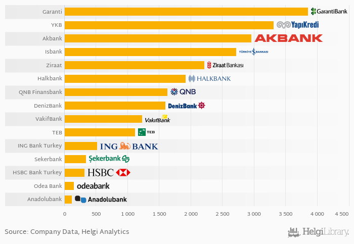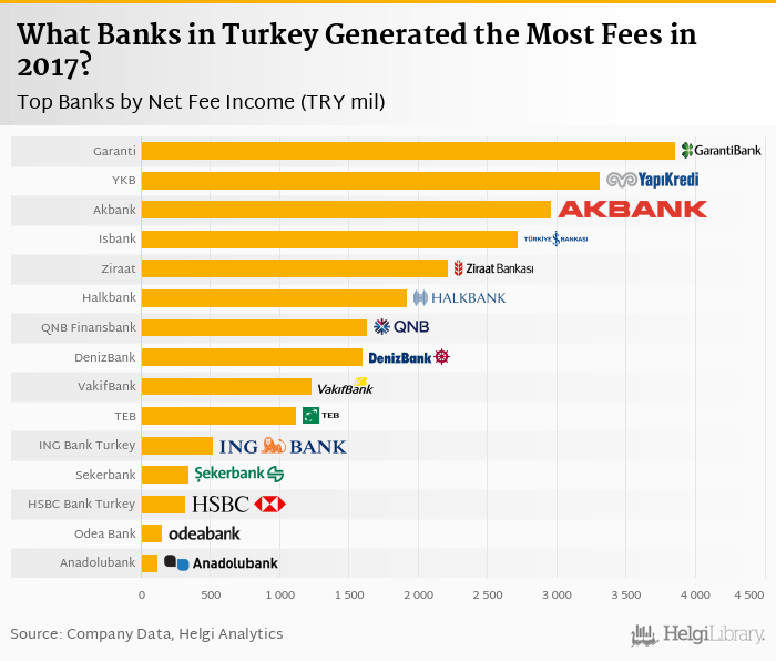 Based on a comparison of 22 banks in Turkey in 2017, Garanti Bank generated the largest fee income, followed by Yapi Kredi Bank and Akbank.