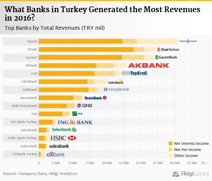 Based on a comparison of 22 banks in Turkey in 2016, Isbank generated the largest revenues, followed by Ziraat Bank and Garanti Bank.