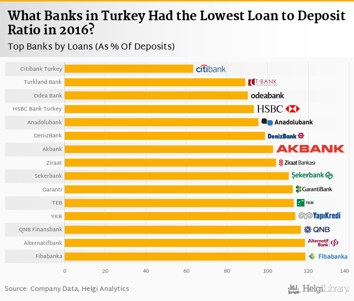 Based on a comparison of 22 banks in Turkey in 2016, Citibank Turkey operated with the lowest loan to deposit ratio, followed by Turkland Bank and Odea Bank.