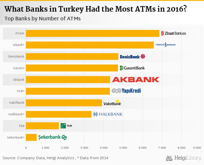 Based on a comparison of 10 banks in Turkey in 2016, Ziraat Bank operated the largest ATM network, followed by DenizBank and Garanti Bank.