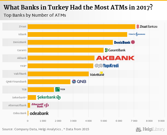 Based on a comparison of 13 banks in Turkey in 2017, Ziraat Bank operated the largest ATM network, followed by Isbank and DenizBank.