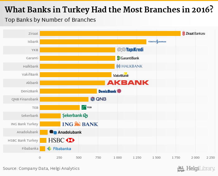 Comparing Ziraat Bank with its closest peers, Isbank operated a network of 1,374 branches in 2016, Yapi Kredi Bank had 974 branches and Garanti Bank had a network of 971 branches in 2016.