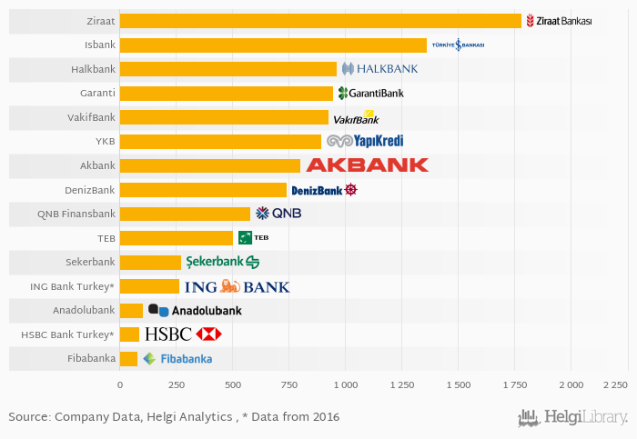 Comparing Ziraat Bank with its closest peers, Isbank operated a network of 1,364 branches in 2017, Halkbank had 963 branches and Garanti Bank had a network of 948 branches in 2017.