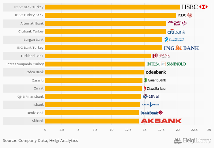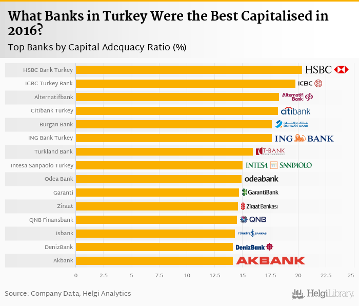 Based on a comparison of 22 banks in Turkey in 2016, HSBC Bank Turkey was the best capitalised bank, followed by ICBC Turkey Bank and Alternatifbank.