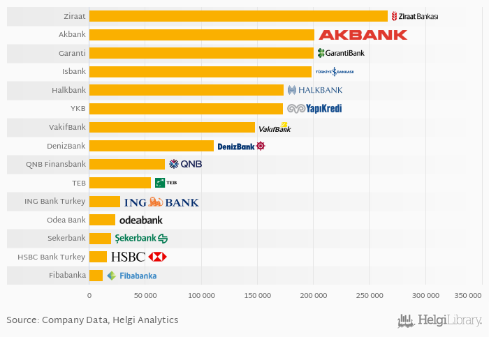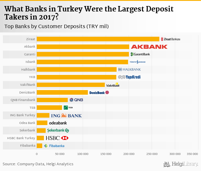 Based on a comparison of 22 banks in Turkey in 2017, Ziraat Bank was the largest deposit taker, followed by Akbank and Garanti Bank.