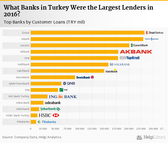 Based on a comparison of 22 banks in Turkey in 2016, Ziraat Bank was the largest lender, followed by Isbank and Garanti Bank.