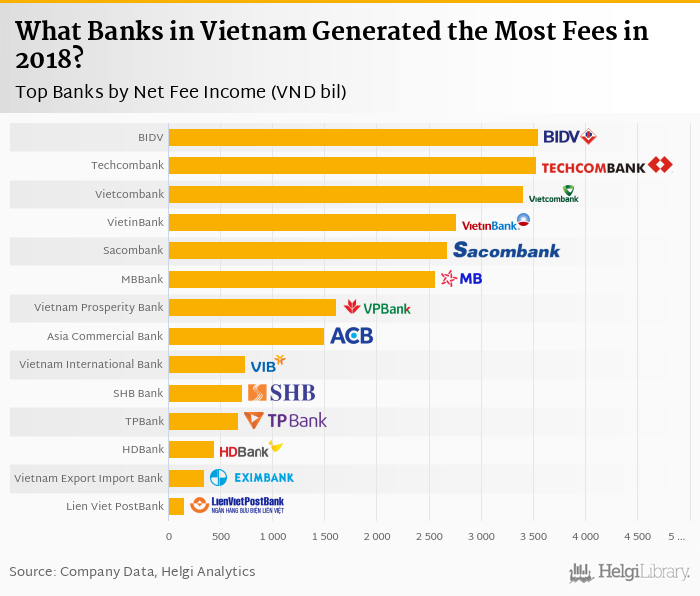 Based on a comparison of 15 banks in Vietnam in 2018, BIDV generated the largest fee income, followed by Techcombank and Vietcombank.
