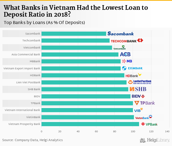 Based on a comparison of 15 banks in Vietnam in 2018, Sacombank operated with the lowest loan to deposit ratio, followed by Techcombank and Vietcombank.