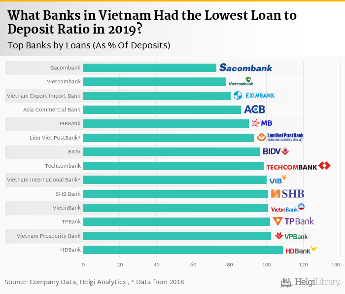 Based on a comparison of 15 banks in Vietnam in 2019, Sacombank operated with the lowest loan to deposit ratio, followed by Vietcombank and Vietnam Export Import Bank.