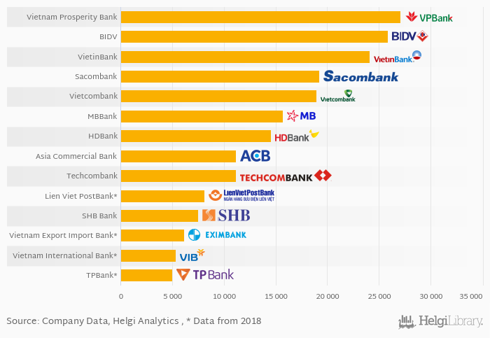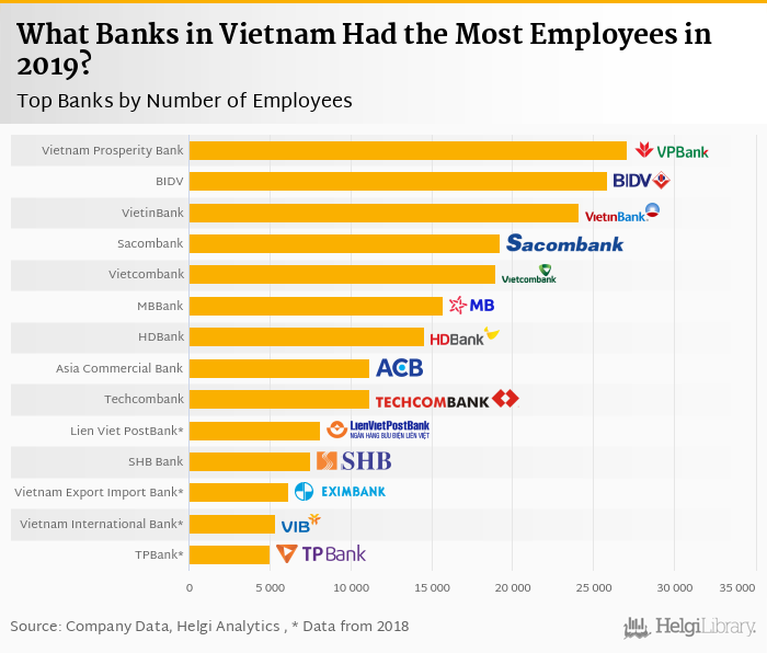 Based on a comparison of 14 banks in Vietnam in 2019, Vietnam Prosperity Bank had the most employees, followed by BIDV and VietinBank.