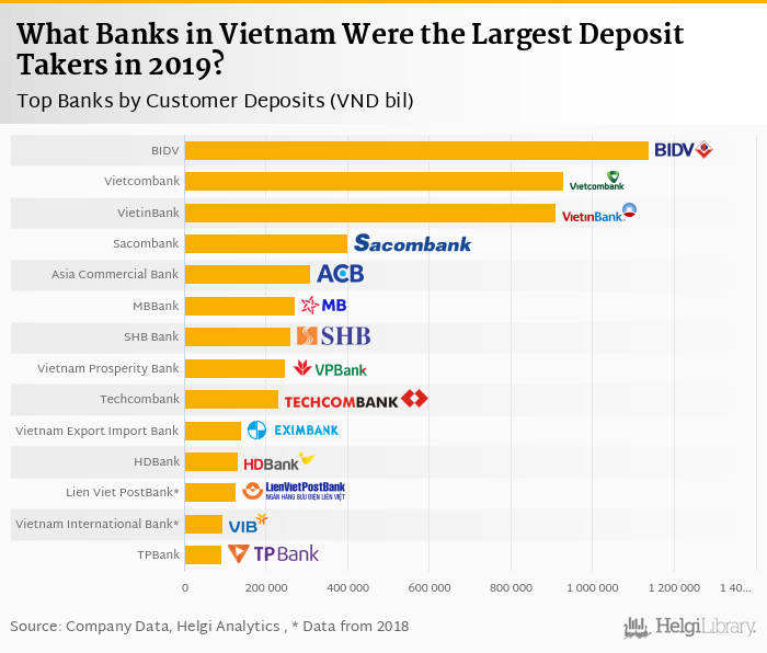Based on a comparison of 15 banks in Vietnam in 2019, BIDV was the largest deposit taker, followed by Vietcombank and VietinBank.