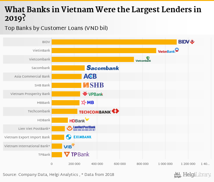 Based on a comparison of 15 banks in Vietnam in 2019, BIDV was the largest lender, followed by VietinBank and Vietcombank.