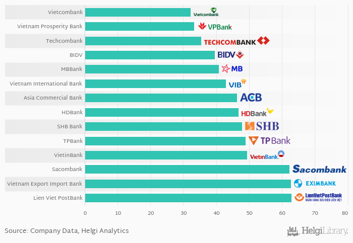 You can see all the banks cost efficiency data on the Costs (As % Of Income) indicator page or you can download a report on the Vietnamese banks in the report section.