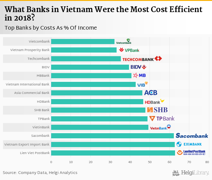 Based on a comparison of 15 banks in Vietnam in 2018, Vietcombank was the most cost efficient bank, followed by Vietnam Prosperity Bank and Techcombank.