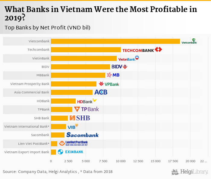 Based on a comparison of 15 banks in Vietnam, Vietcombank produced the highest net profit in 2019, followed by Techcombank and VietinBank.
