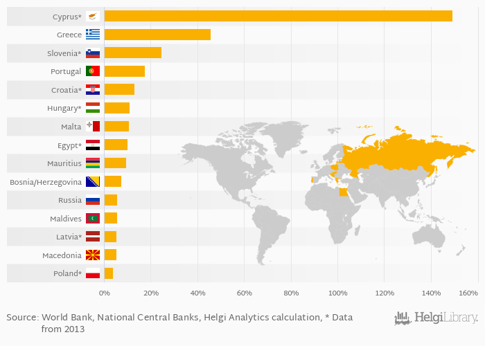 Based on a comparison of 62 countries in 2015, Cyprus ranked the highest in non-performing loans as a share of GDP with 149% followed by Greece and Slovenia. On the other end of the scale was El Salvador with 0.116%, Argentina with 0.279% and Afghanistan with 0.296%.