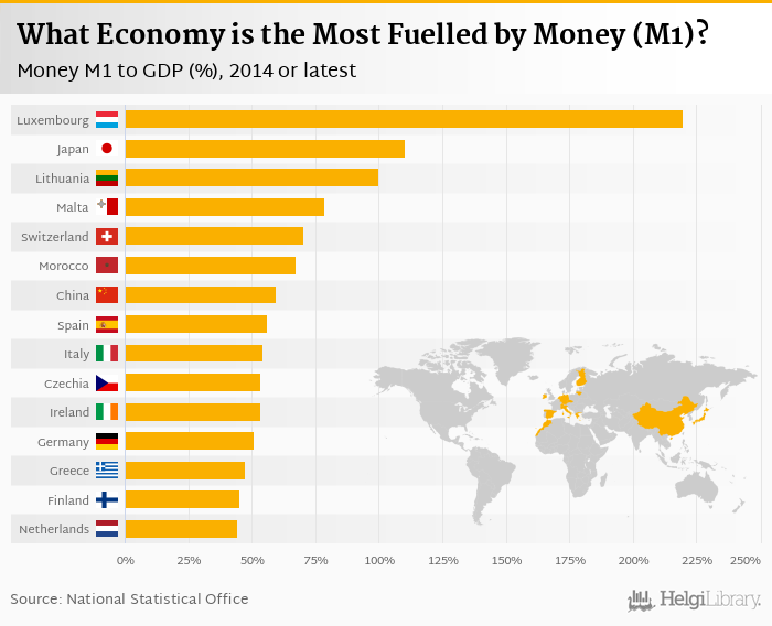 Based on a comparison of 71 countries in 2011, Luxembourg ranked the highest in money, M1 as a share of GDP with 220% followed by Japan and Lithuania. On the other end of the scale was Brazil with 6.50%, Iran with 7.92% and South Korea with 9.30%.
