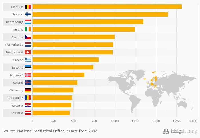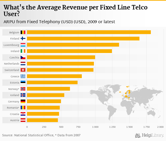 Based on a comparison of 27 countries in 2009, Belgium ranked the highest in ARPU from fixed telephony with USD 1,817 followed by Finland and Luxembourg. On the other end of the scale was Bulgaria with USD 149, Lithuania with USD 192 and Slovenia with USD 229.