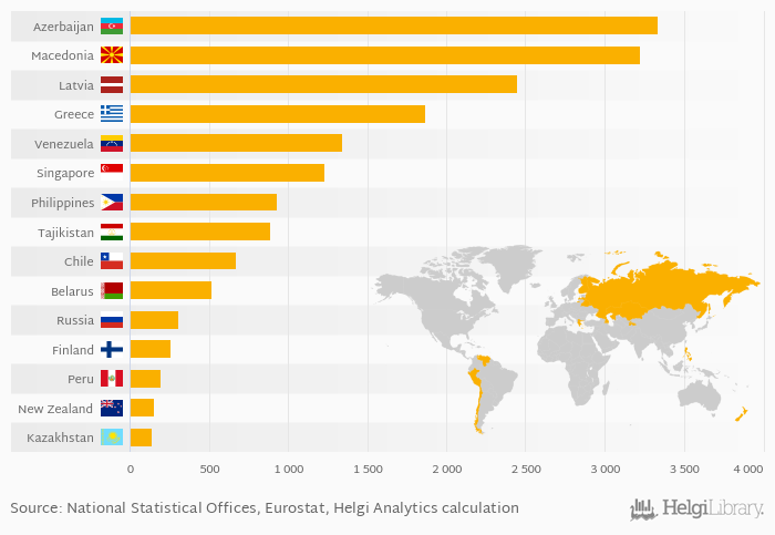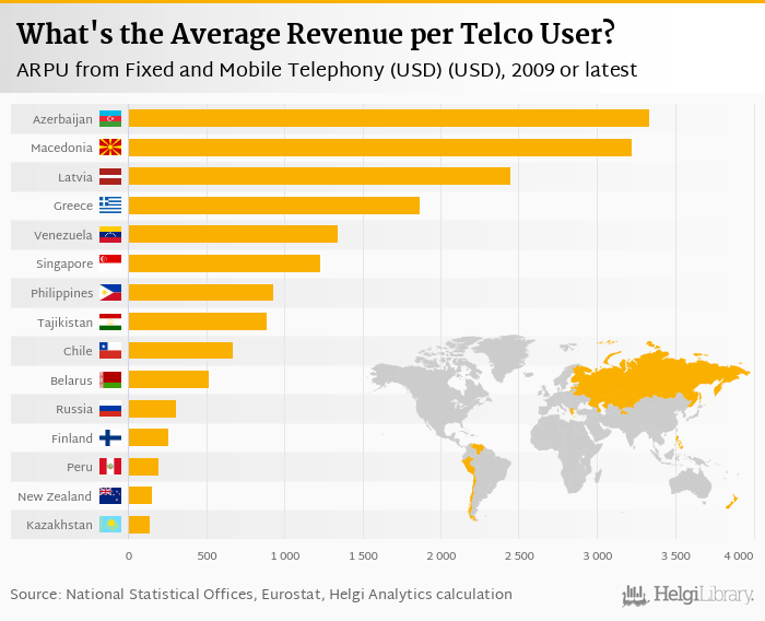 Based on a comparison of 17 countries in 2009, Azerbaijan ranked the highest in ARPU from fixed and mobile telephony with USD 3,339 followed by Macedonia and Latvia. On the other end of the scale was Thailand with USD 9.64, USA with USD 13.1 and Kazakhstan with USD 140.