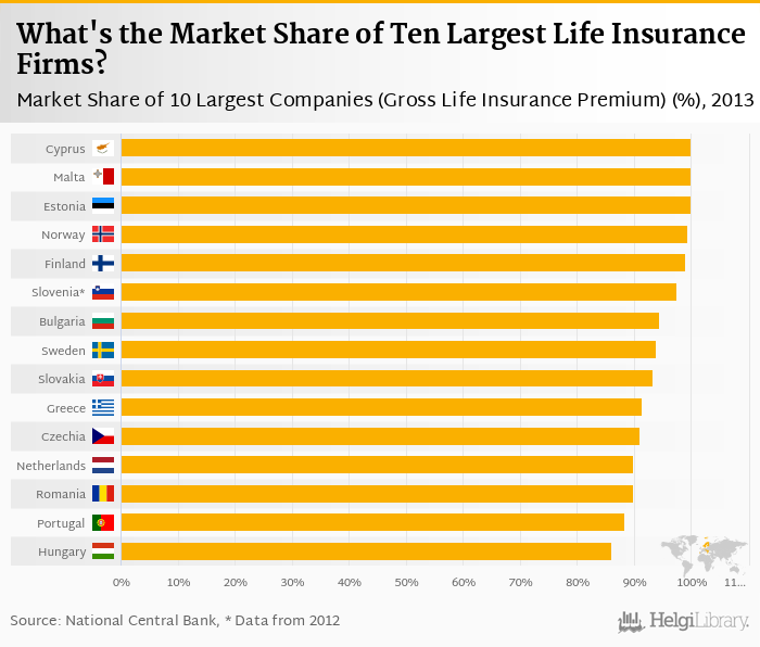 Based on a comparison of 28 countries in 2013, Cyprus ranked the highest in market share of 10 largest companies in gross life insurance premium with 100% followed by Malta and Estonia. On the other end of the scale was Croatia with 24.7%, Germany with 56.2% and Spain with 61.0%.