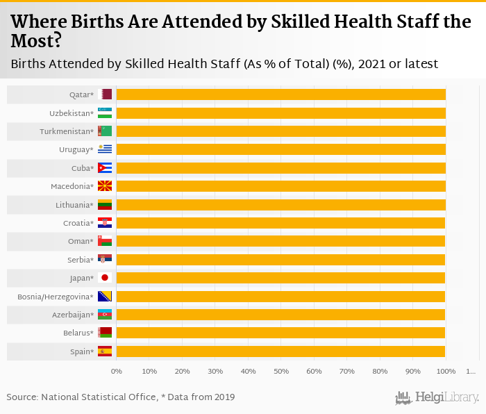 Based on a comparison of 59 countries in 2022, Uruguay ranked the highest in births attended by skilled health staff as a share of total with 100% followed by Macedonia and Lithuania. On the other end of the scale was South Sudan with 39.7%, Niger with 43.7% and Madagascar with 45.8%.