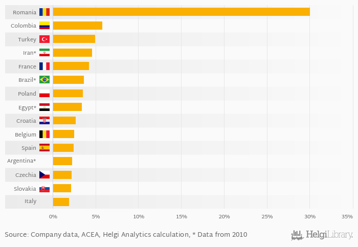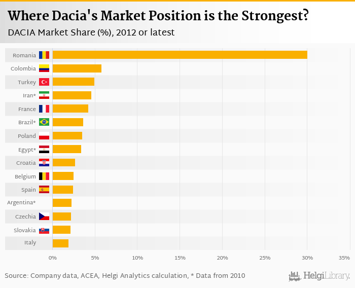 Based on a comparison of 26 countries in 2017, Romania ranked the highest in Dacia market share with 30.0% followed by Colombia and Turkey. On the other end of the scale was Denmark with < 0.001%, Venezuela with 0.004% and Sweden with 0.223%.