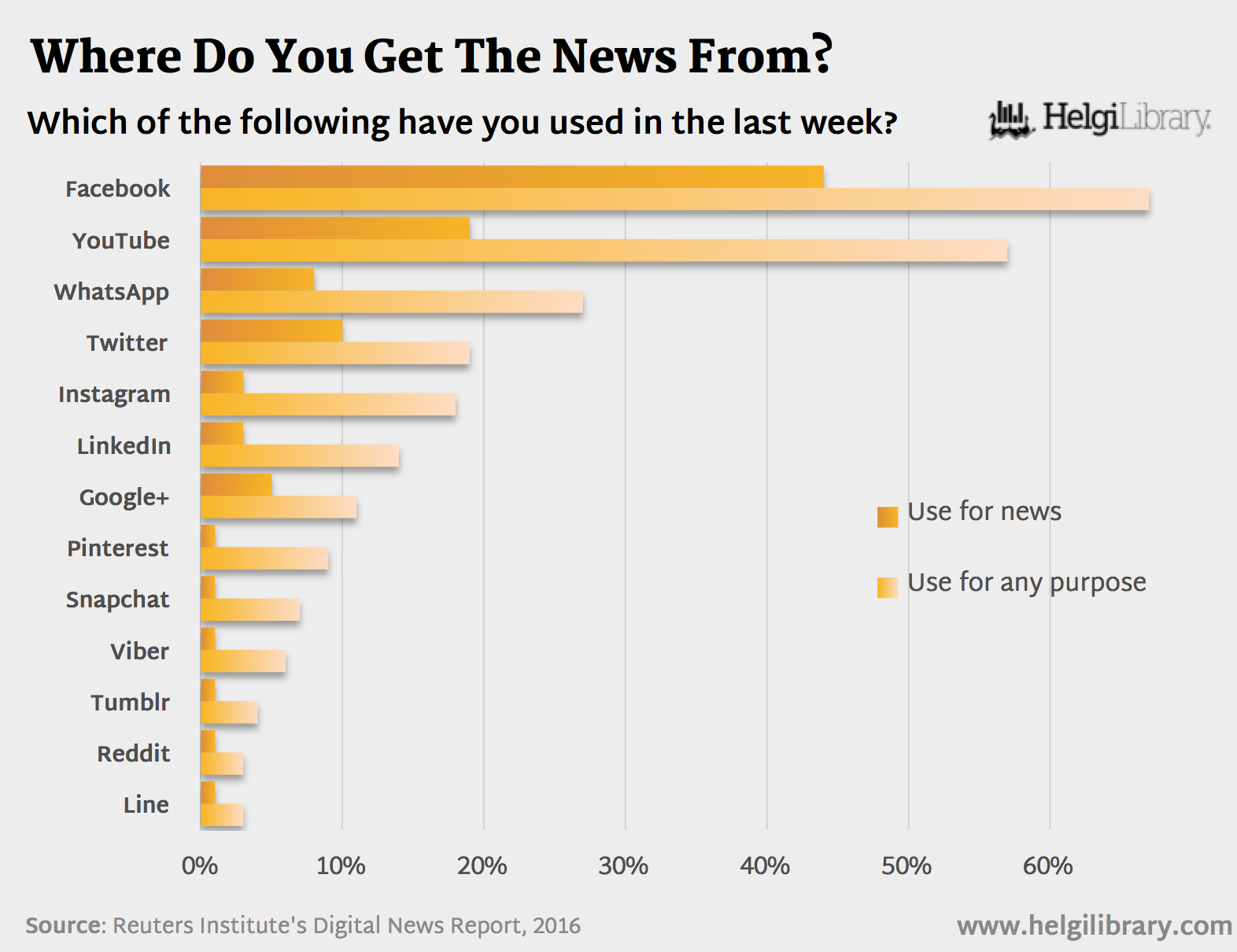 Half people say they use social media as a source of news each week, according to the latest Reuters Institute's Digital News Report. Around one in ten say it is their main source.